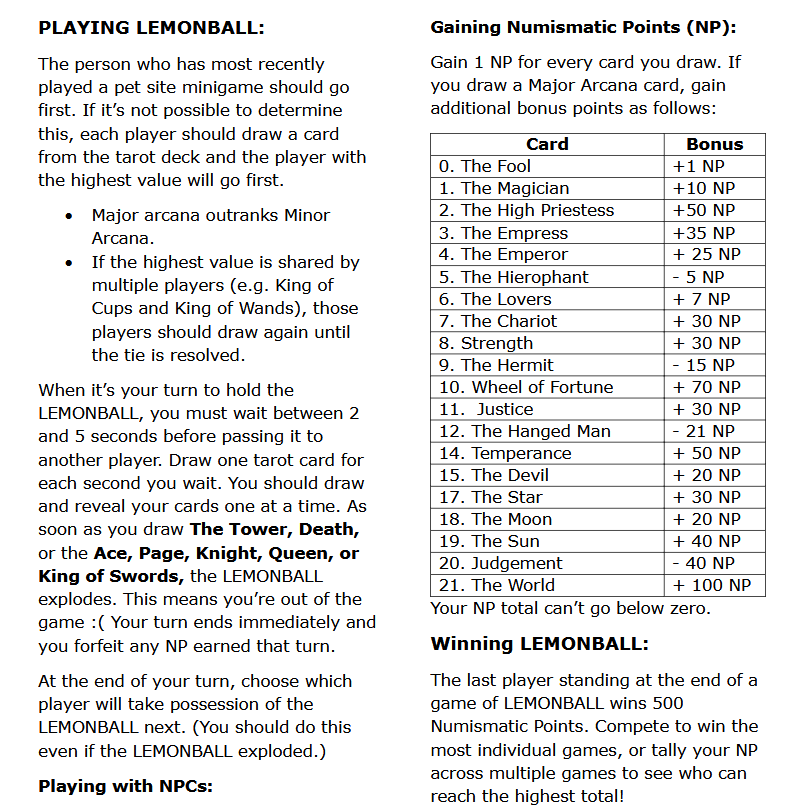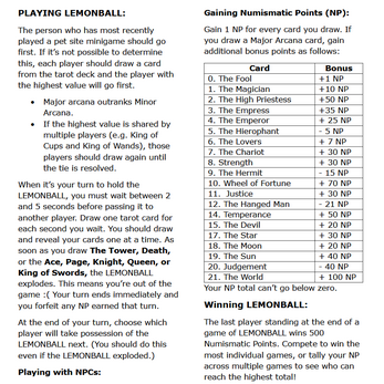LEMONBALL uses a Tarot deck for standard play, and also optionally uses dice (D8 and D4) for smaller groups or solo play.