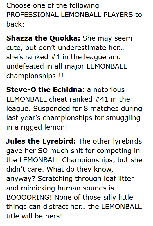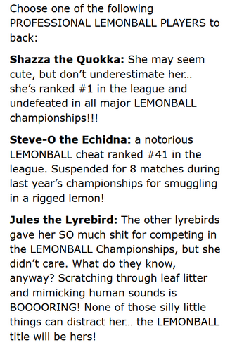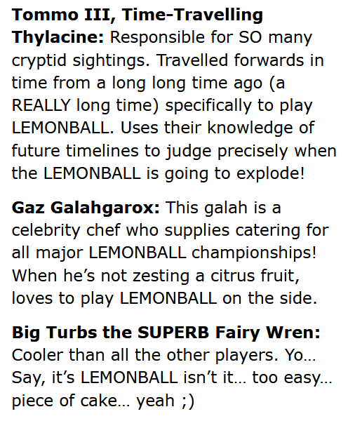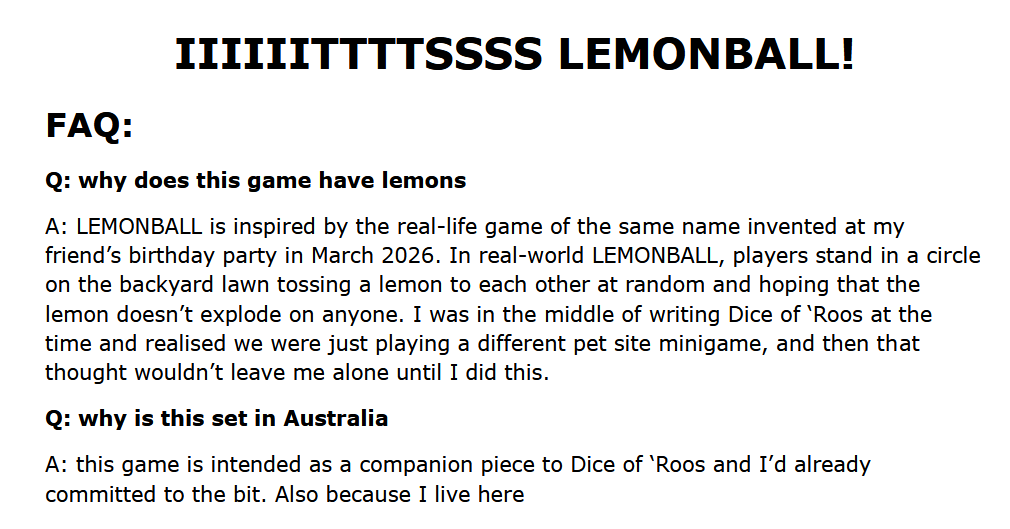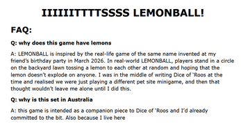 LEMONBALL is a submission for the Go Weave a Basket Game Jam and can be played either as a standalone game, or as a supplementary minigame for Dice of 'Roos. Any Numismatic Points collected in LEMONBALL can be transferred to your Bank in Dice of 'Roos.